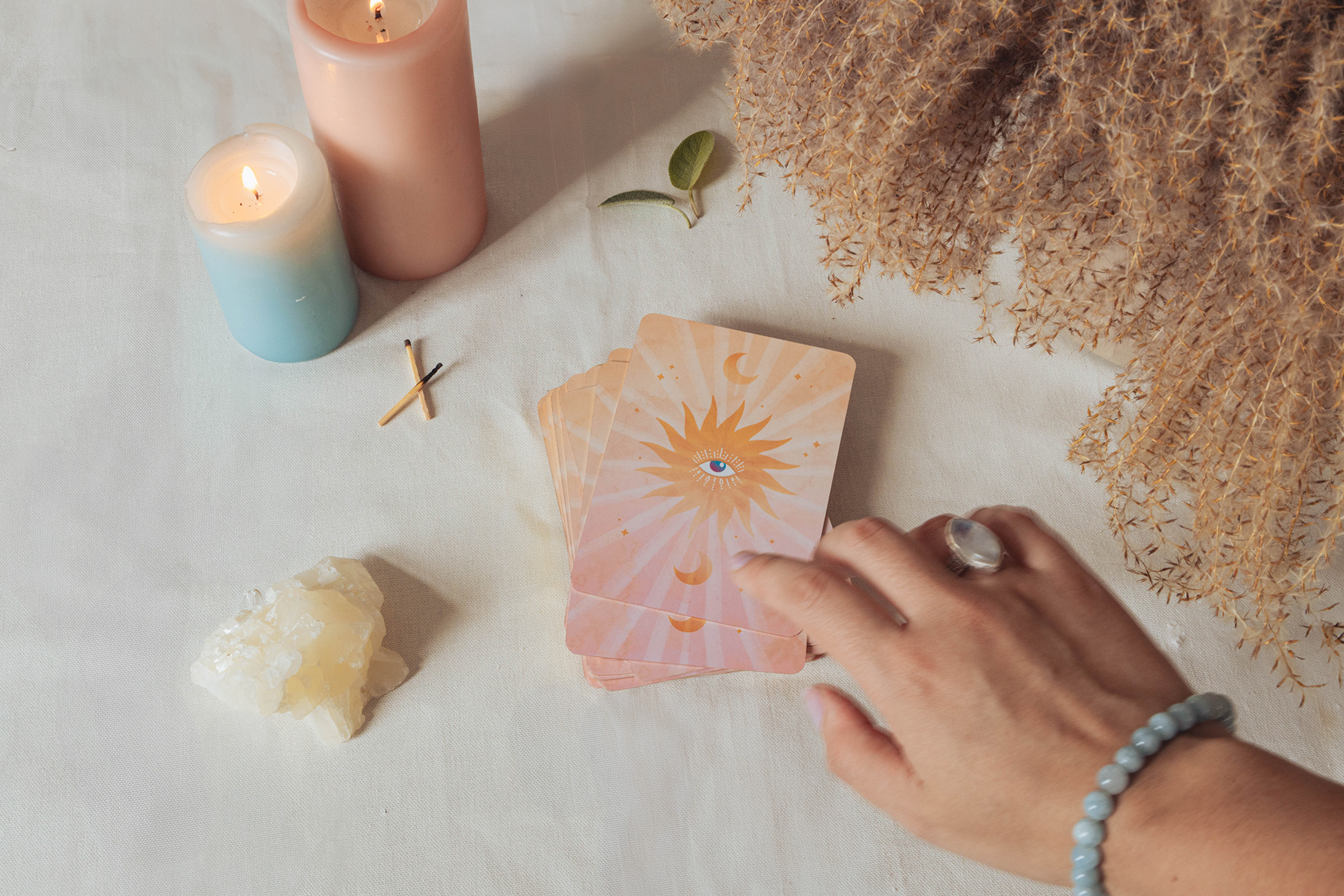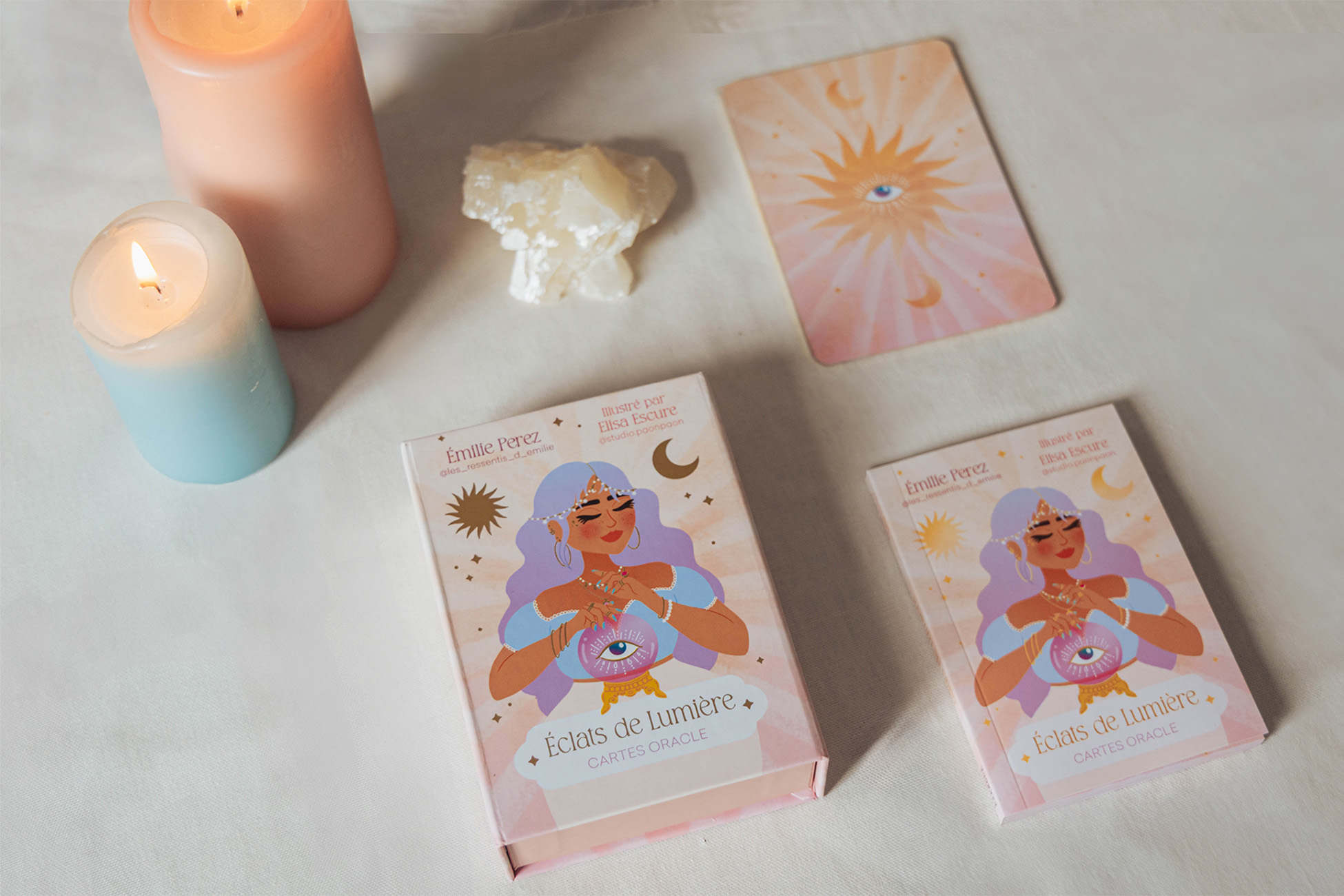 J’ai travaillé autour d’une palette de couleurs pastels, en accord avec les illustrations, pour valoriser à la fois le coffret et les cartes. L’idée était de mêler prises de vue produit et ambiance lifestyle, afin de montrer l’oracle dans un contexte réel, vivant et inspirant.